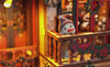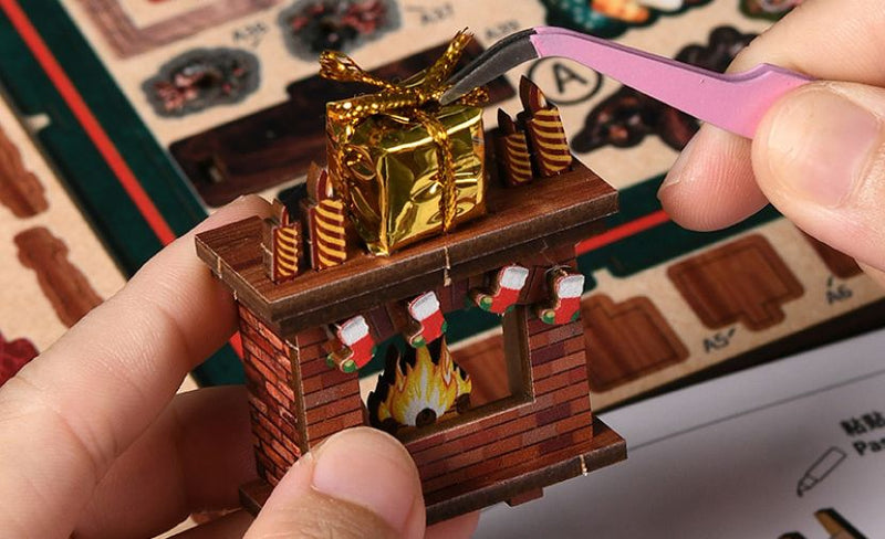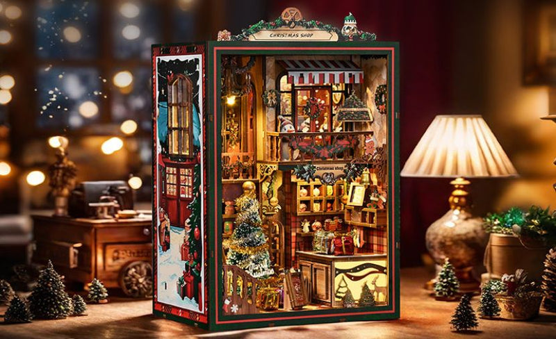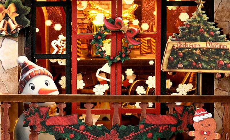 Cada pieza de madera precortada encaja a la perfección, permitiéndote recrear una encantadora tienda navideña, desde estantes decorados hasta el escaparate con una cálida iluminación que crea el ambiente navideño perfecto.